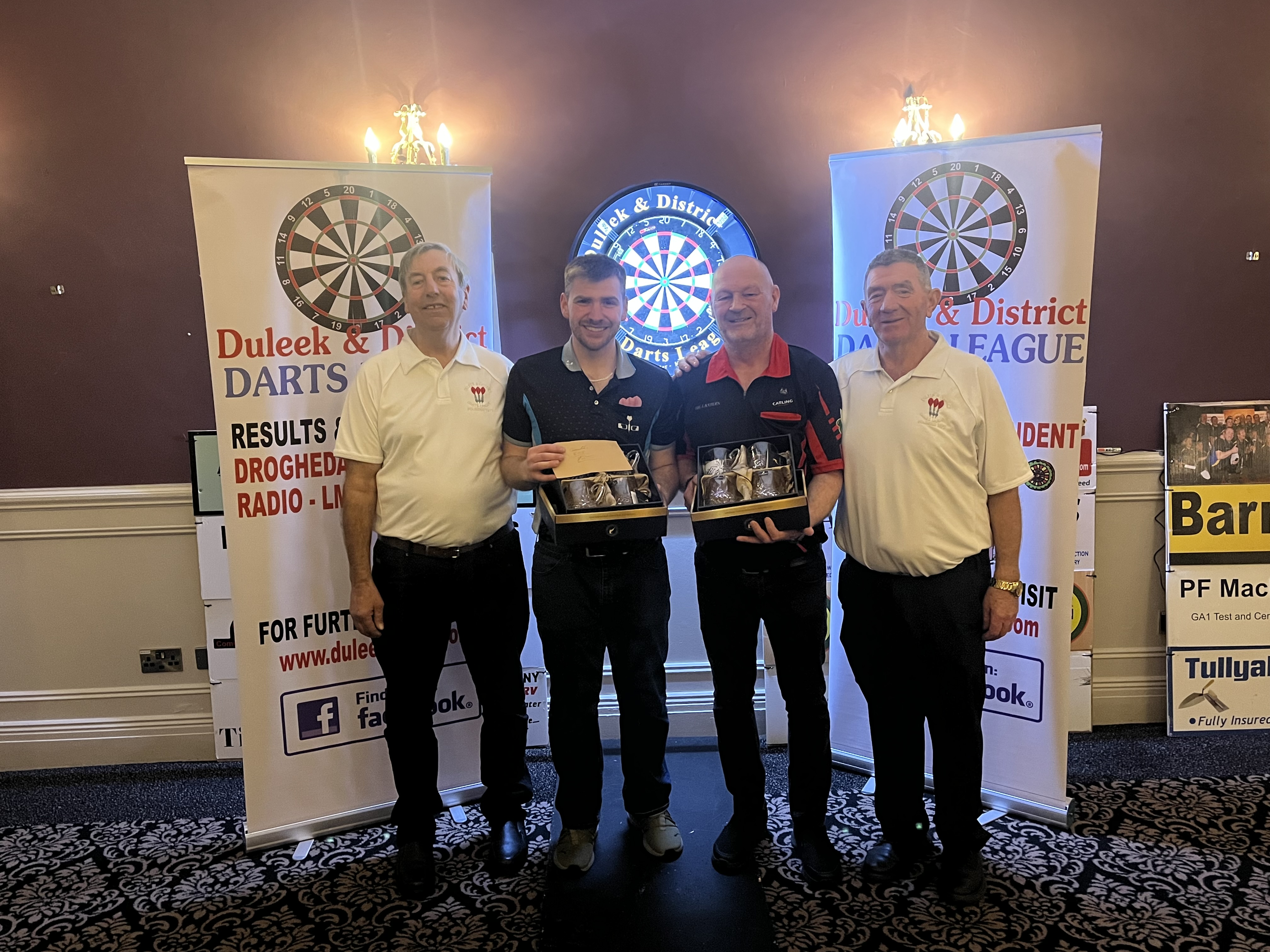 Photo 1 - Doubles - Winner 2023 / 2024 - Ronan Donnelly and Jason O Brien, Judge & Jury, Trim. Photo 2 - Doubles - Runner Up 2023 / 2024 - Robert Smith and Damian Hethrington, Mariner. Photo 3 - Plate Winner 2023 / 2024 - Kean Barry, Nanny's. Photo 4 - Plate Runner-Up 2023 / 2024 - Simon Rogers, Cottage Inn. |